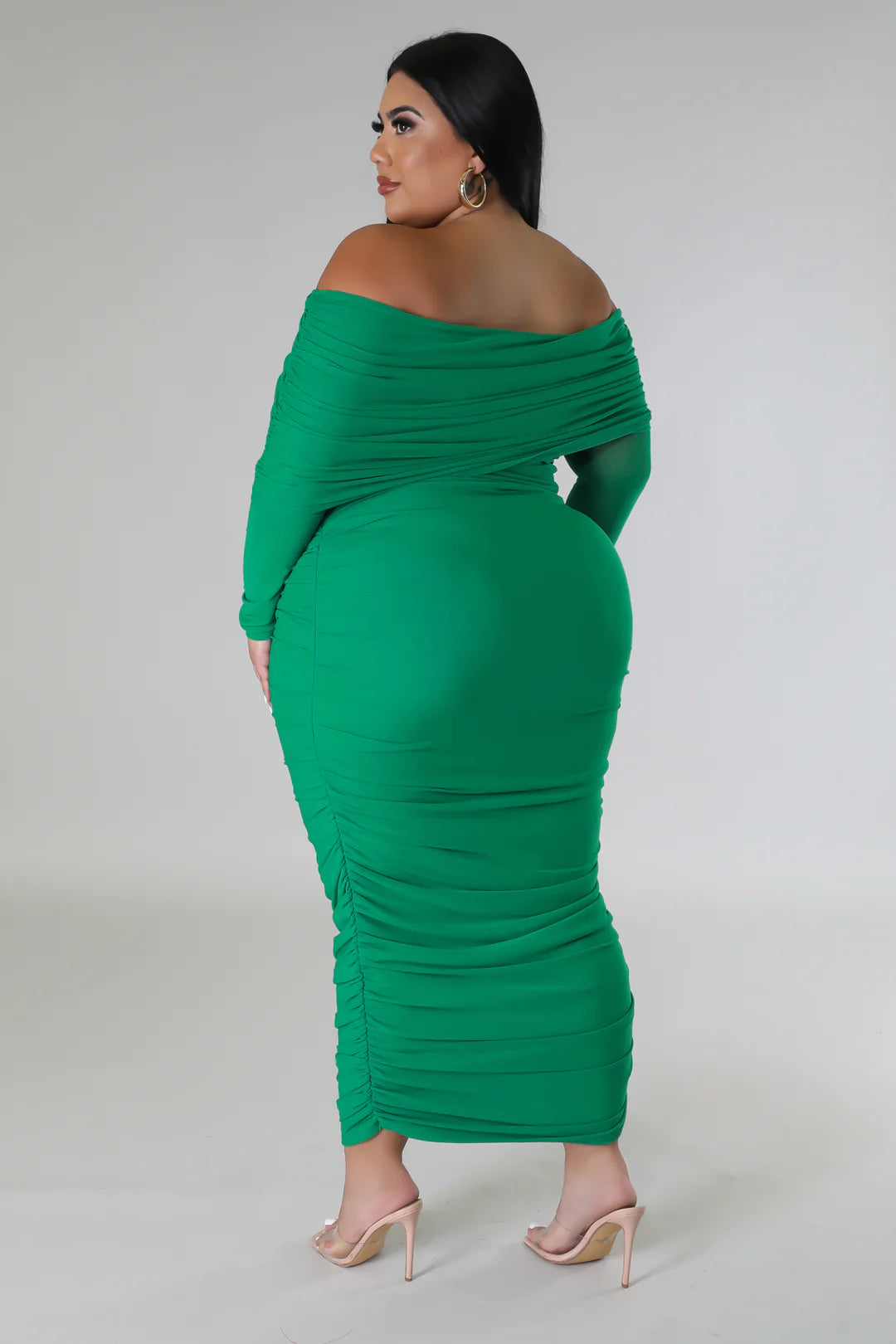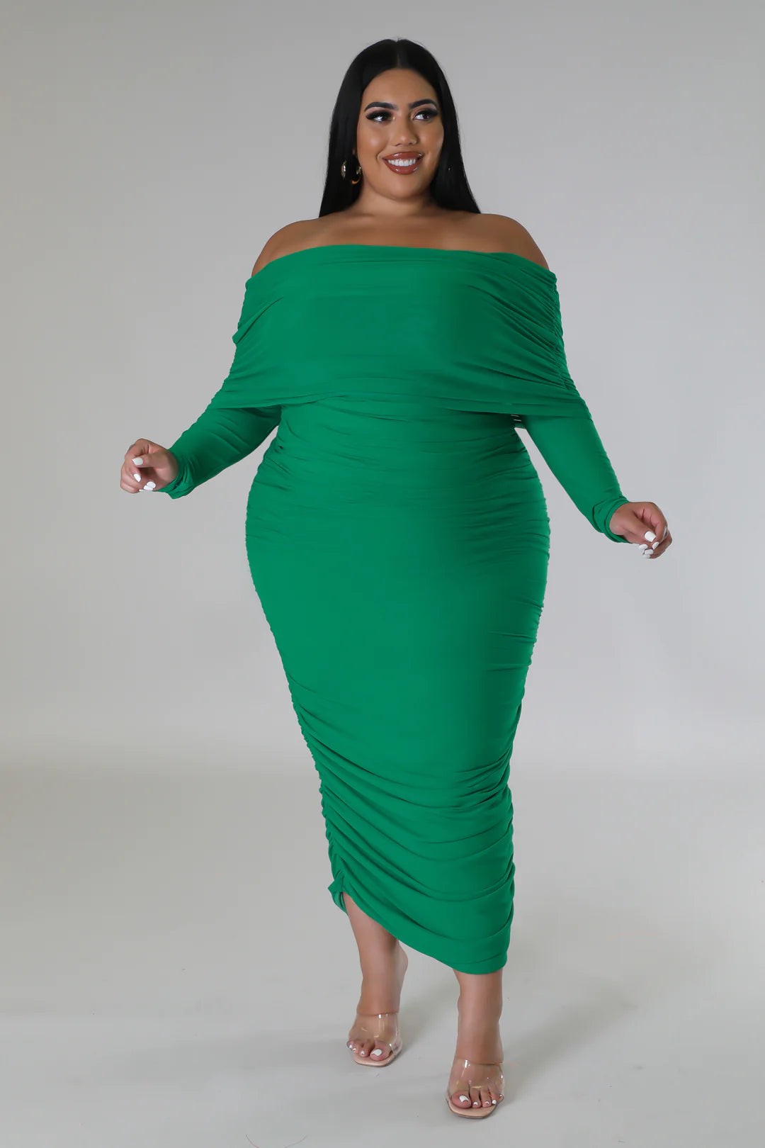 This strapless, off-shoulder stretch dress features long sleeves and a flattering silhouette with no closure. It is available in a variety of sizes, including a 2X, and can easily be dressed up or down for any occasion.