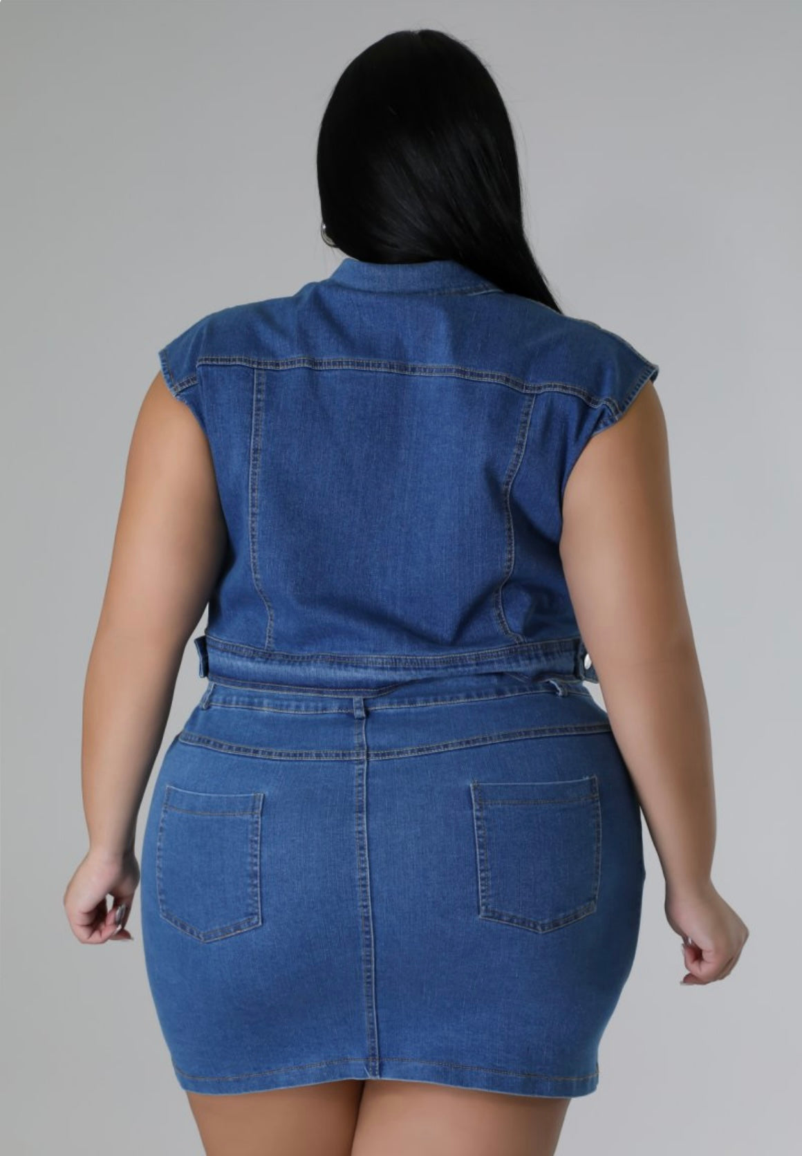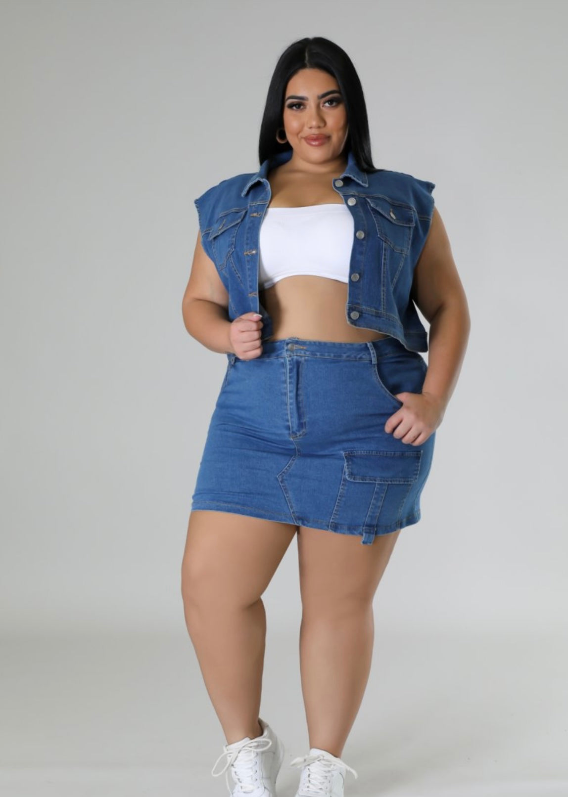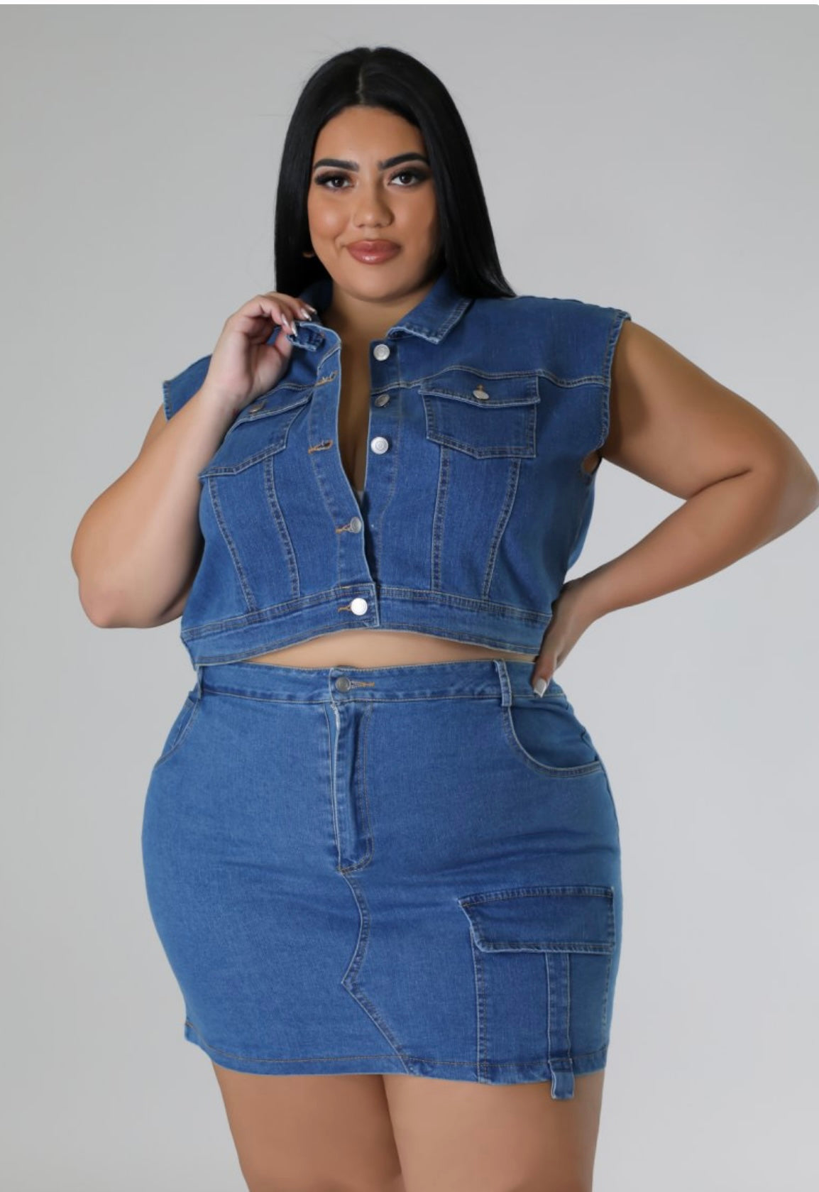 - The Nu-Nu Set includes a sleeveless button-up collar jacket, and a high-waisted denim skirt with a high-waisted design, elastic waistband, and convenient pockets. Made of 75% cotton, 23% polyester, and 2% spandex, this set is best hand washed in cold water.